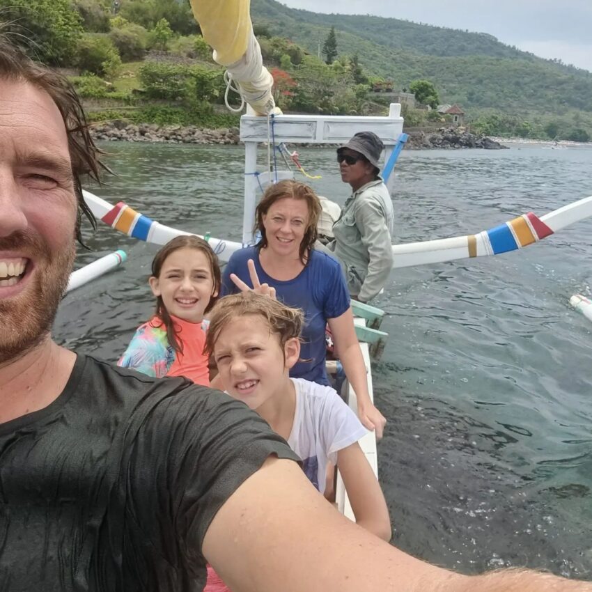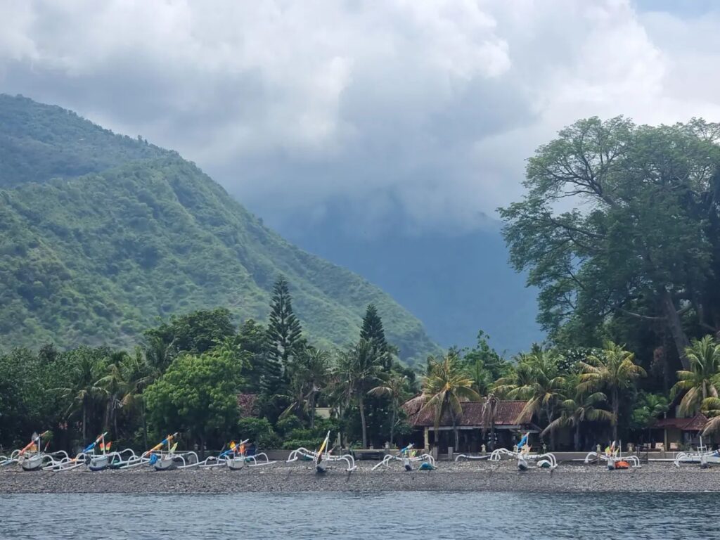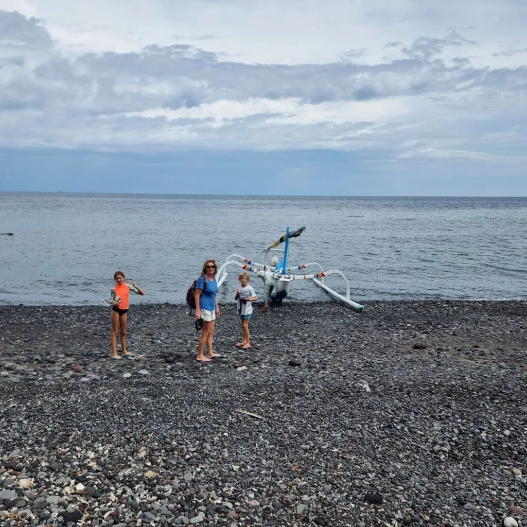 Amed was heel relaxed. In het begin konden we geen hotel vinden want sommige zaten vol en in een hotel mochten geen kinderen slapen…..Bizar…..Maar goed uiteindelijk sliepen we in een hotel met huisjes aan het strand en dat was het hotel waar Theo en ik 15 jaar geleden ook in hadden geslapen. Super toevallig. We hebben een traditionele visserboot gehuurd (praam) en zijn bij een wrak wezen snorkelen. Naast alle mooie vissen en koraal zagen we ook een schildpad, slang en een mureen.