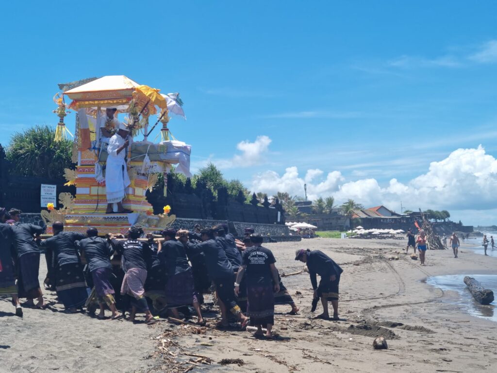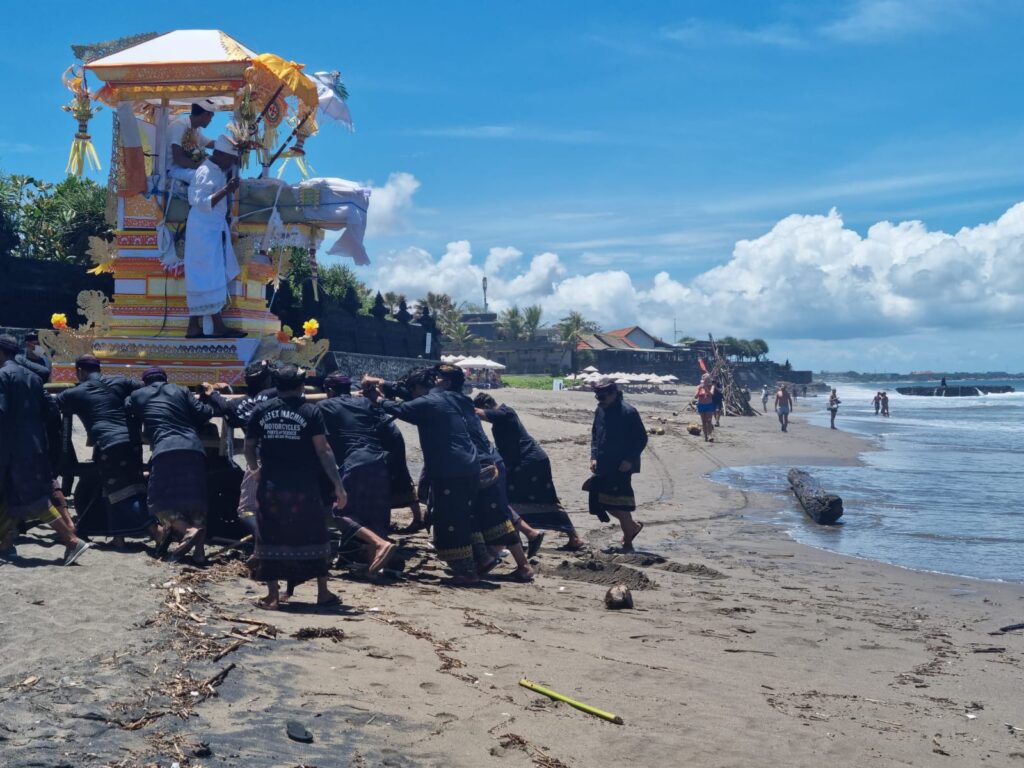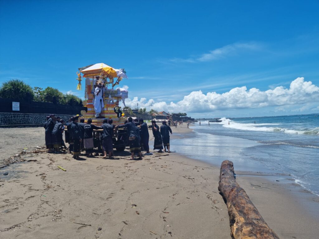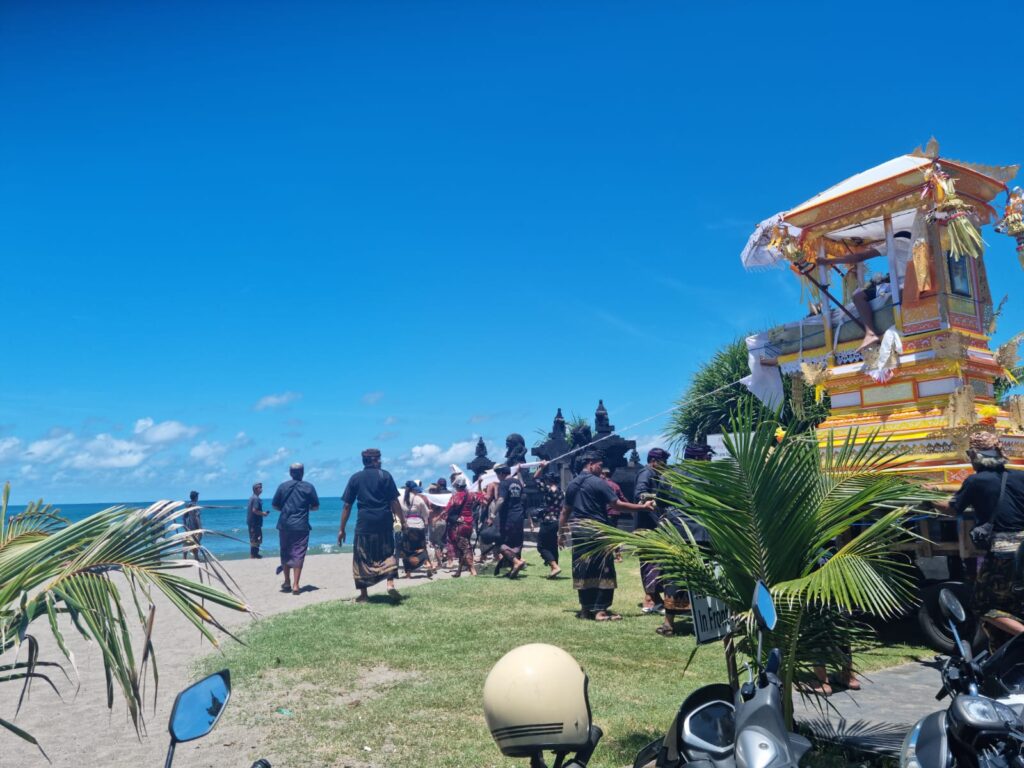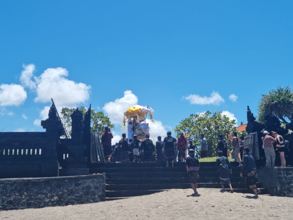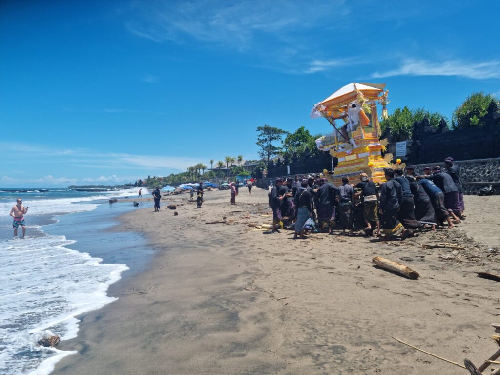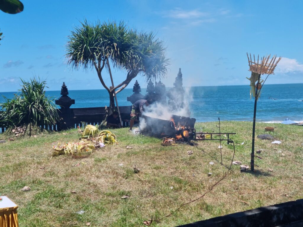 Eenmaal bij het strand kwamen we bij de crematieplek in de tempel. Ik heb netjes gevraagd of ik mee naar binnen mocht. Ik was de enige Bule (blanke buitenlander) en voelde me toch een beetje een soort ramptoerist, maar het was gelukkig geen probleem. In de tempel tilden de mannen het lichaam, ingewikkeld in doeken, uit de kist en legden het op de plek waar ze het lichaam zouden verbranden. De priester verwijderde de doeken, waardoor iedereen voor het laatst het lijk kon zien. Vervolgens bedekte hij het lichaam weer met andere doeken en vond er nog een laatste ceremonie plaats met offers en heilig water.