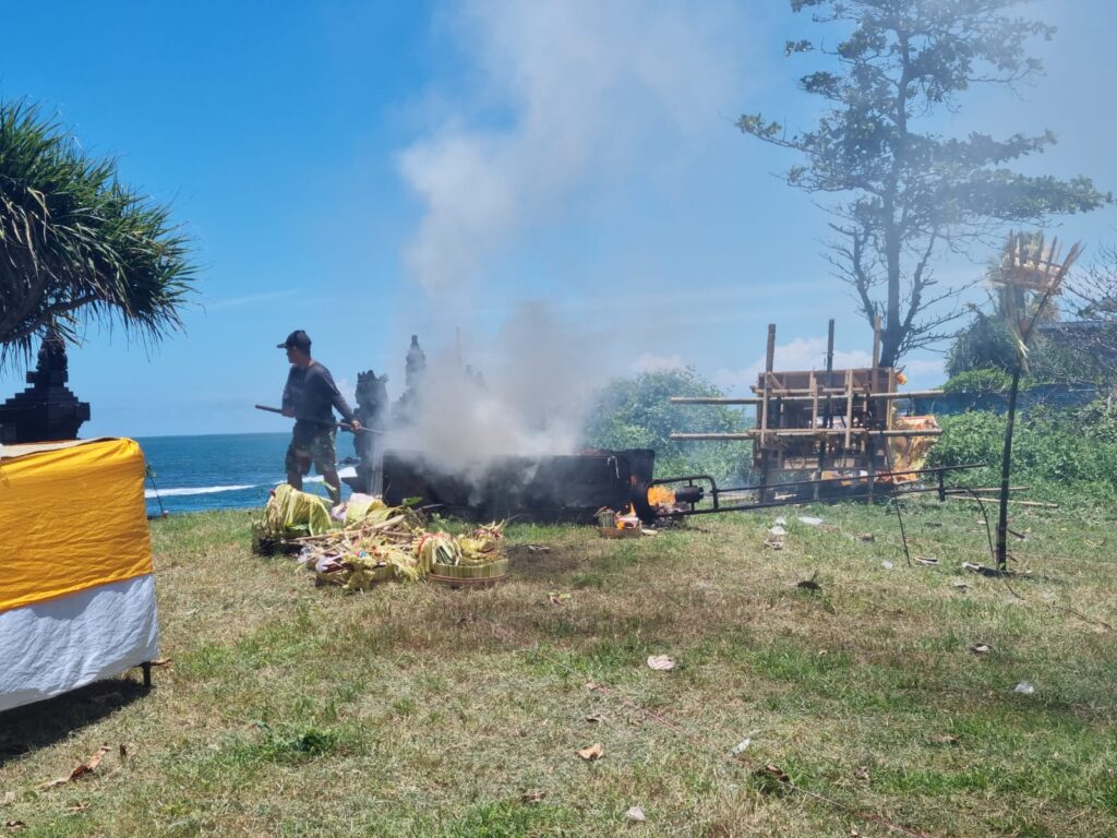 Het afscheid was genomen. De gastank met de gasbrander werd klaargezet en een vrouw zei tegen me dat ik ergens anders moest gaan staan omdat de crematie begon. Ik ging aan de zijkant staan bij de rest. De gasbrander werd aangezet. Een donkere wolk met een vreemd geurtje kwam onze kant op. Het was wel vreemd dat een paar meter verder touristen op het strand lagen te chillen.