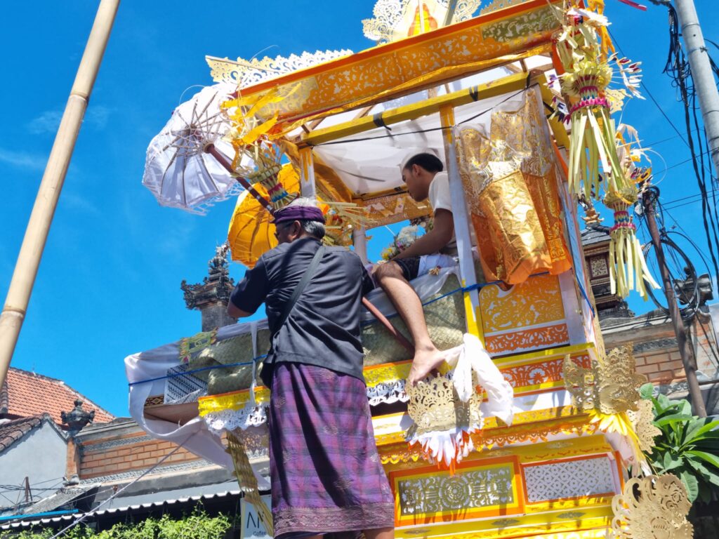 Een foto van een oudere vrouw hing aan de Wadah. Het was haar crematie en haar lichaam lag dus in de kist. Op haar kist zat een jongen van begin 20. Hij zal wel de kleinzoon van de vrouw zijn. Ook de priester stond later op de wadah. Hij hield een stok vast waaraan een nepvogel hing. De wadah stond op een kar met wielen die door meerdere mannen door de straat werd geduwd. Daarom heen liepen mannen mee die lange stokken bij zich hadden. Met deze stokkken werden de elektriciteitsdraden en de takken van bomen omhoog geduwd zodat het hele gevaarte eronder door kon. Dat ging dan ook weleens mis, waardoor hele takken en draden naar beneden vielen. Niemand die zich daar druk om maakte.