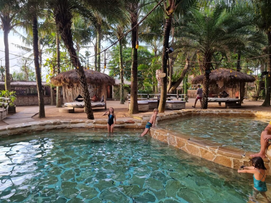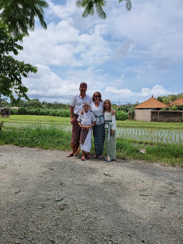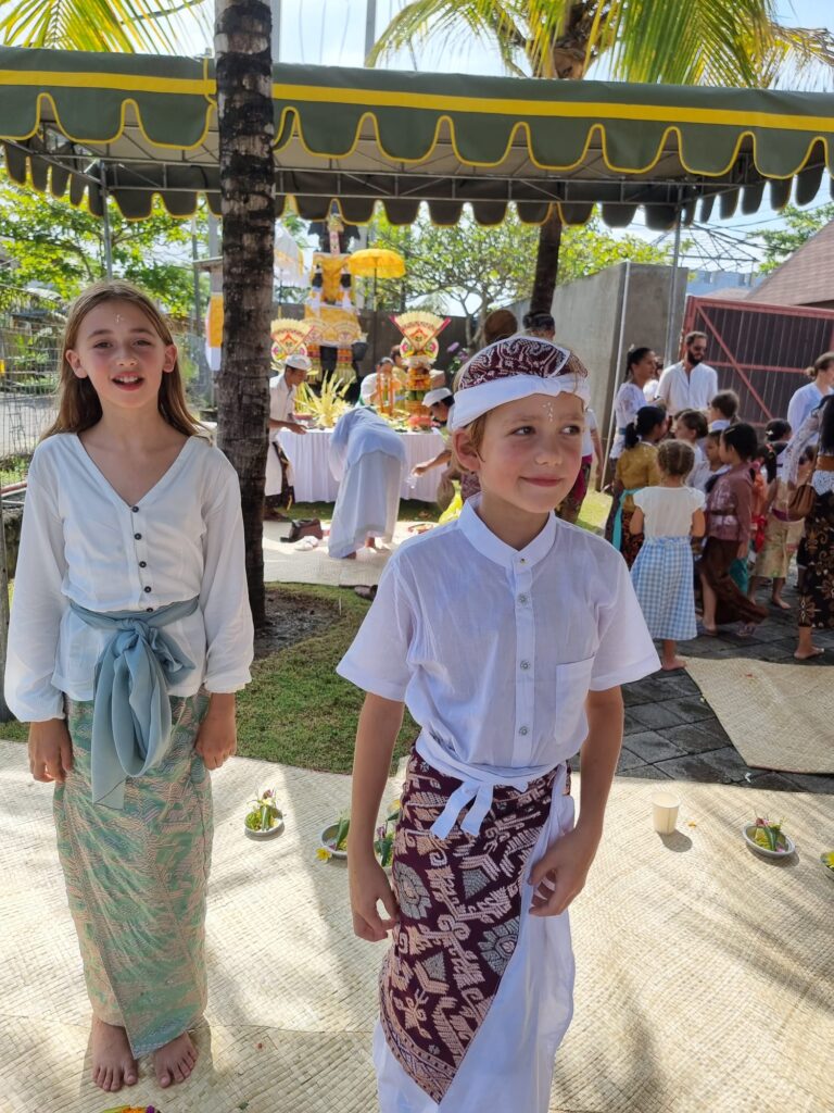 Afgelopen zaterdag hadden we ook een ceremonie van school. Het was de dag van Saraswati, de godin van de kennis, muziek, kunst, spraak, wijsheid en van het onderwijs. Theo, ik en de kids hadden allemaal traditionele Balinese kleding aan. Op school was een priester die de ceremonie deed. We kregen eerst water over ons hoofd en daarna moesten we bidden. Eerst bidden zonder bloempje tussen je hand, vervolgens met een bloem zonder kleur tussen je handen, dan een bloem met kleuren en uiteindelijk weer zonder bloem. Daarna kreeg je 3 keer water over je hoofd, moest je het water uit je hand drinken en als laatste het water over je hoofd vegen. Ja, Saraswati was best bijzonder.